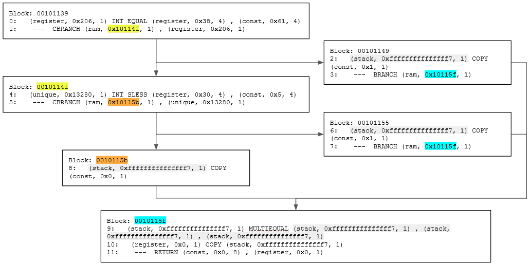 One nice thing about Pcode when it comes to analysing a function’s control and data flow is that it is in a Single Static Assignment (SSA) form. That is, each varnode is assigned only once, and has to be defined before use. This makes it easy to track the program’s flow, since we do not need to worry if a varnode is redefined (It can’t). As such, we can easily trace how a function works in Pcode by following the definitions of varnodes to get the function’s control flow graph.