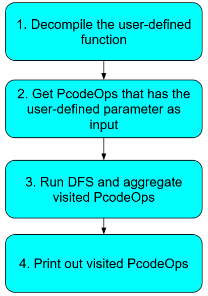 Ok, we’ve finally cleared the necessary theoretical pre-requisites! As a mini practical, let us write a Ghidra script to perform taint analysis by traversing a function and obtaining all PcodeOps that are directly reachable from a parameter. While this may not be that useful of a script, it serves to give you a basic understanding of manipulating Pcode using the Ghidra API. The script’s main logic looks like this:
