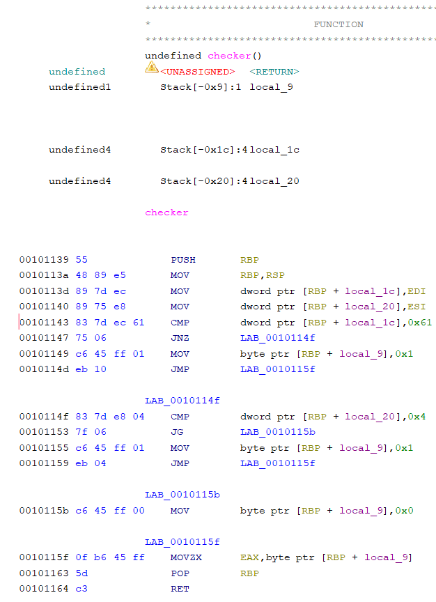 When a binary is first loaded into Ghidra, it is disassembled into machine instructions. A set of heuristics is then used to extract functions that are present in the binary. Figure 2 below shows the disassembled instructions of the checker function.