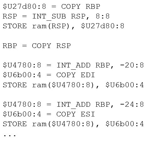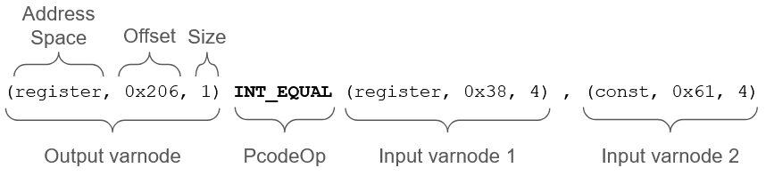 As a side note, some PcodeOps take in inputs whose purpose may not be immediately clear. As an example, the LOAD PcodeOp takes as its first argument a varnode whose value corresponds to the constant ID of the address space to load from. While these cases usually turn out to not be that important, it is recommended to refer to here to understand the details of each PcodeOp.