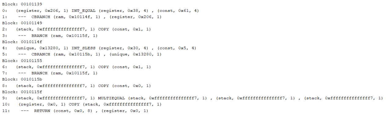 Each function is then independently converted into a form of Pcode called raw Pcode. To do this, Ghidra has a set of specifications that directly convert each machine instruction into a series of 1 or more raw Pcode. The first few raw Pcode of the checker function is shown in Figure 3 (I truncated it as there are too many lines of raw Pcode). The lines shown correspond to the first 4 lines of disassembled code in Figure 2.