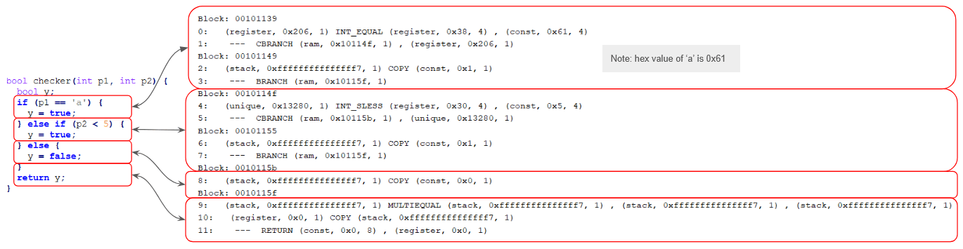 We can extend this understanding to analyse simple programs. In the figure below, we place the source and Pcode of the function checker side-by-side to explicitly show the correspondence in logic between the two.