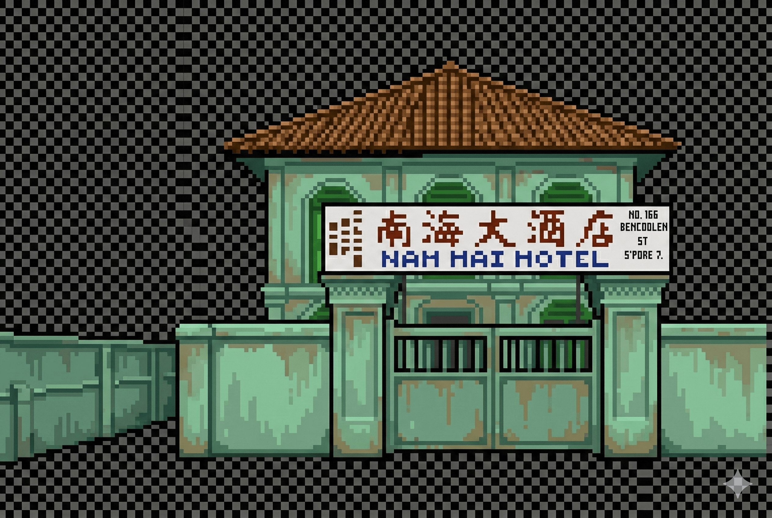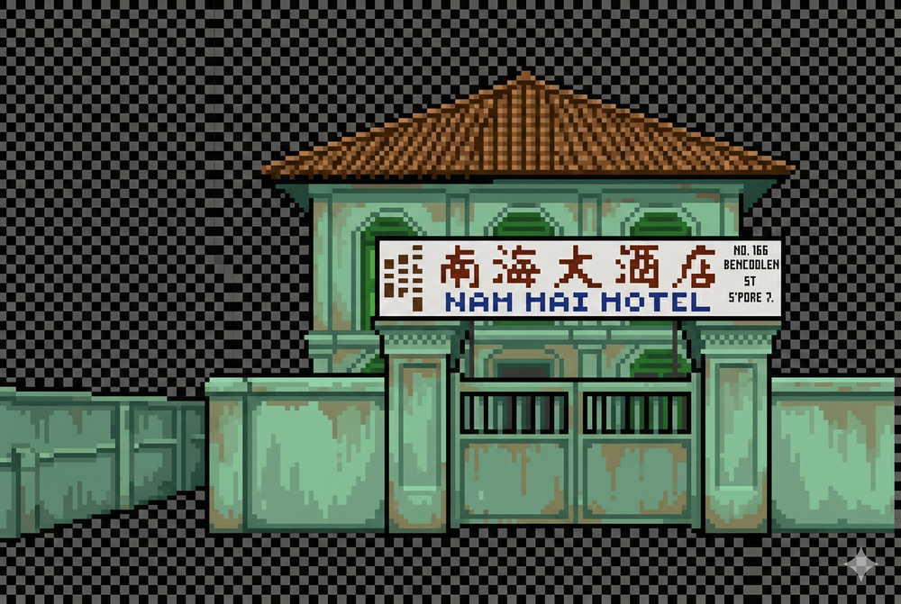 Fig. 1 - Pixel Art of the Historical Nan Hai Hotel located at 166 Bencoolen Street (image generation: Google Gemini Pro).